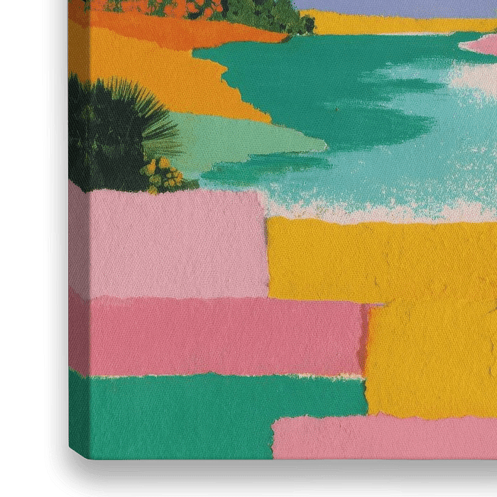 Dit gestileerde, kleurrijke landschapschilderij toont een diepblauwe lucht met witte wolken boven een kalme strook water in groenblauwe en blauwgroene tinten. Horizontale kleurblokken in roze, oranje, geel, groen, groenblauw en blauw lopen langs de onderrand van het schilderij, gescheiden door witte lijnen. Aan weerszijden omlijsten…
