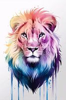 Dit prachtige ontwerp toont een majestueuze leeuw in levendige, vloeiende kleuren. De zachte aquareltinten lopen in elkaar over, van warme roze- en oranje tinten naar koele blauw- en paarstinten, wat het geheel een dynamische en speelse uitstraling geeft. De leeuw straalt kracht en sereniteit uit, en de subtiele details van de manen en het gezicht geven diepte aan het ontwerp. Dit stuk is perfect om een moderne, artistieke flair toe te voegen aan elke ruimte, of het nu in de woonkamer, slaapkamer of op kantoor is. Het kleurrijke verloop en de gedetailleerde weergave maken dit ontwerp een echte blikvanger voor liefhebbers van moderne kunst en dierenportretten.