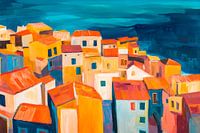 Een levendig mozaïek van warme gele en oranje tinten brengt een dromerige stad weer tot leven. De schuine daken dansen in het licht, terwijl de kleurrijke gevels verhalen van vervlogen tijden vertellen. Een diep, mystiek blauw vormt de achtergrond en benadrukt de architectonische diversiteit die de blik in de verte trekt.