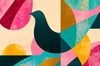 Levendige geometrie ontmoet de zachte elegantie van een vogel die zweeft in harmonieuze kleurtonen. De mix van gedurfde en zachte kleuren en de speelse vormen geven de kamer een dynamische energie. Perfect voor een woonkamer die creativiteit en gezelligheid belichaamt.