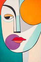 Een fascinerend portret dat speelt met felle kleuren en geometrische vormen. De ogen stralen een mysterieuze sereniteit uit, terwijl de lippen in felrood uitnodigend zijn. De combinatie van zachte en gedurfde tinten maakt dit kunstwerk perfect voor een moderne woonkamer, waar het kan inspireren tot een gesprek.