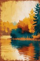 Dit prachtige kunstwerk straalt rust en elegantie uit met zijn levendige kleuren en serene compositie. De weergave van een kalm meer omringd door bomen in warme geel- en oranjetinten met accenten van koel blauw en groen creëert een perfecte balans tussen energie en rust. Dit kunstwerk voegt een verfijnde sfeer toe aan elke ruimte, ideaal voor een moderne woonkamer of kantoor. Het spel van licht en reflectie in het water maakt het ontwerp dynamisch en visueel boeiend. Perfect voor liefhebbers van abstracte kunst met een natuurlijk thema.