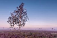 Frisse herfstkleuren tijdens zonsopkomst met enkele berk in heide veld met contrast van intens blauwe atmosfeer in de achtergrond en vegetatie te zien door de ochtenddauw in magenta en oranje kleuren van opkomende zon.