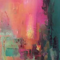 Kleurrijk modern abstract schilderij in felle kleuren: roze, groen, geel, oranje en zwart. Woonstijl modern en abstract.