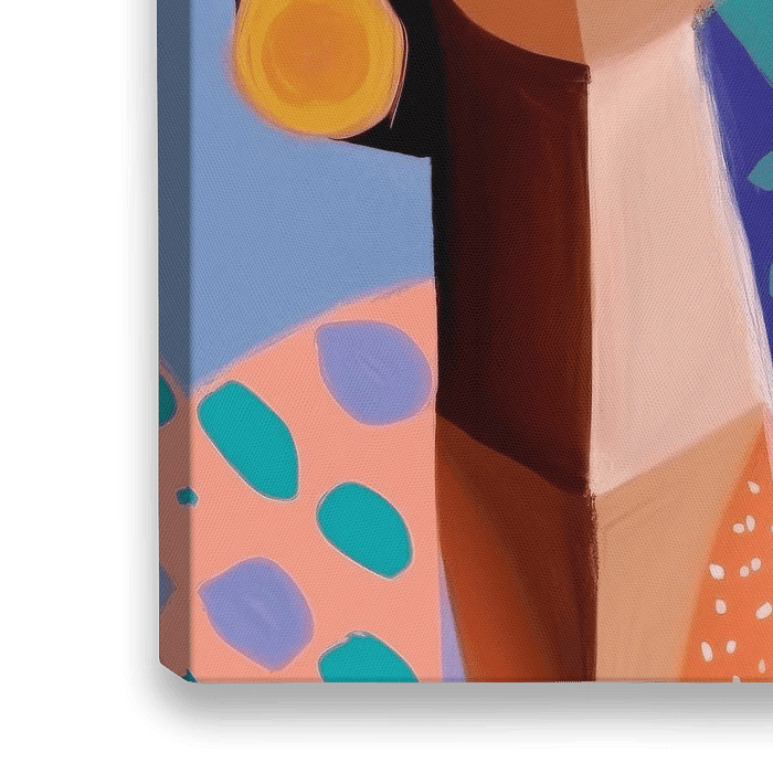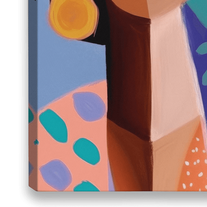 Kleurrijk, modern en abstract portret van een vrouw met grote oorbellen, kleding in paars, groen, lila en oranje. Met dit werk maak je een echt statement aan je muur! Woonstijl bohemian, modern en abstract.