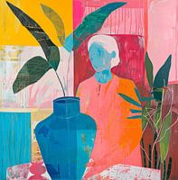 Kleurrijk modern en abstract portret met botanische elementen. Hippe illustratie in allerlei kleuren, helemaal in de trend van nu. Kies zelf het formaat en materiaal bij dit vrolijke werk.