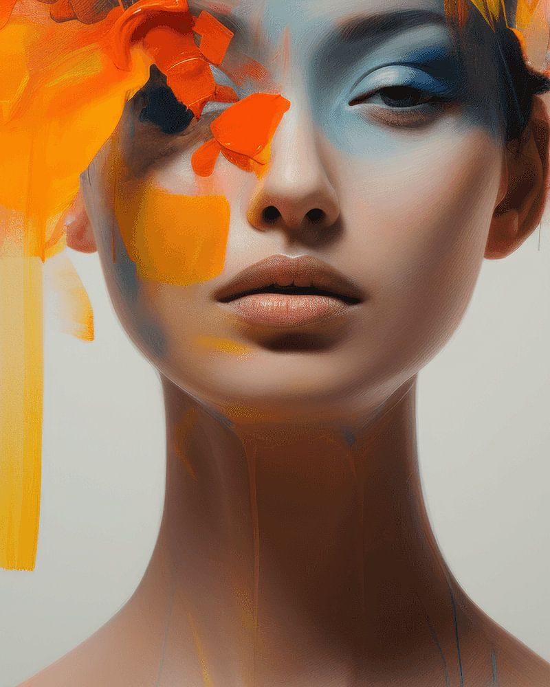 Kleurrijk, modern en abstract portret van een jonge vrouw in geel, oranje, roze en blauw. Kies zelf het formaat en het materiaal. Een echte blikvanger aan je muur!