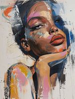 Kleurrijk modern en abstract portret in blauw, roze en geel. Kies zelf het formaat en materiaal bij dit werk en maak er een echte blikvanger van voor jouw interieur.