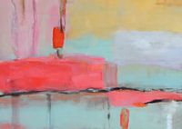 Kleurrijk modern en abstract schilderij in roze, geel oranje en blauw. Zowel zachtroze als hardroze zijn gebruikt om contrast toe te voegen.