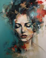 Kleurrijk modern portret van een jonge vrouw met gesloten ogen. Door het gebruik van warme kleuren en grove penseelstreken is dit een stoer en toch ook zacht werk geworden. Mooi in ieder interieur!