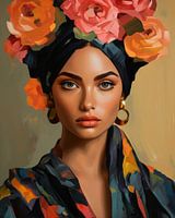 Een kleurrijk, modern portret met Spaanse invloeden. Kies zelf de afmeting en het materiaal om zo dit werk helemaal passend voor je interieur te maken.