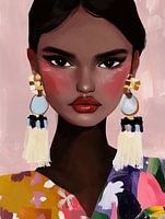 Kleurrijk modern portret van een jonge vrouw met grote oorbellen. Dit werk past perfect in een eclectisch interieur. Een bijzondere blikvanger voor je interieur! Kies zelf het formaat en materiaal bij dit werk en maak het helemaal naar wens.