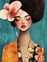 Kleurrijk modern portret van een jonge vrouw met grote bloem in het haar voor een blauwe achtergrond. Een bijzondere blikvanger voor je interieur! Kies zelf het formaat en materiaal bij dit werk en maak het helemaal naar wens.
