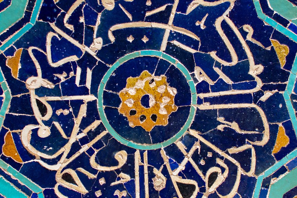 Een kleurrijk mozaïek op de muur van een grote moskee in Iran.