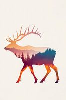 Een majestueus hert wandelt door een dromerig landschap van glooiende bergen en dichte bossen, oplichtend in levendige kleuren. Deze creatieve combinatie van dier en natuur brengt een harmonieuze rust en is perfect voor de woonkamer om een uitnodigende, ontspannen sfeer te creëren.