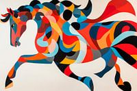 Een krachtig, dynamisch paard in een levendig samenspel van warme roodtinten, diep zwart en stralend blauw trekt ieders aandacht. De gebogen lijnen stralen beweging en vrijheid uit, ideaal voor een woonkamer die karakter en energie wil uitstralen. Dit kunstwerk voegt een levendige sfeer toe aan elke kamer.