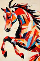Een dynamisch kleurenspel ontvouwt zich als een krachtige, gestileerde hengst majestueus in de lucht springt. De levendige rode, blauwe en oranje tinten geven het motief een bijzondere energie. Dit kunstwerk brengt beweging en levensvreugde in elke woonkamer en trekt op magische wijze de aandacht van gasten.