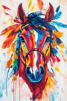 Het majestueuze karakter van een paard wordt gecombineerd met heldere druppels rood, blauw en geel in een fascinerend kleurenspel. Het hoofd en de manen worden omlijst door dynamische, kleurrijke streken die doen denken aan een vurige, creatieve expressie. Veerachtige elementen geven de afbeelding een vleugje wildheid en vrijheid.