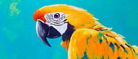 Stralend in helder geel en turquoise, geeft deze papegaai de indruk dat hij elke kamer vult met zijn levendige energie. De fascinerende details en vrolijke uitdrukking maken het de ideale blikvanger in een woonkamer of keuken, waar het de omgeving verrijkt met joie de vivre.