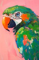 Te midden van een zachtroze kleur straalt de papegaai met zijn weelderige, groene gevederde kop en levendige, oranje snavel een fascinerende levendigheid uit. De vaardige penseelstreken brengen de kleuren tot leven en geven het dier een bijna magische aanwezigheid, terwijl zijn doordringende blik de kijker uitdaagt om de schoonheid van de natuur te herkennen.