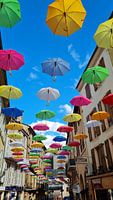 Veel, vel gekleurde paraplu's boven een winkelstraat in de Franse plaats Mende. Gevangen op een zomerse middag in augustus 2021.