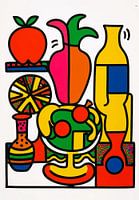 Dit kleurrijke pop-art stilleven combineert moderne vormen met levendige kleuren om een opvallend decoratiestuk te creëren. Perfect voor interieurs die een speelse en dynamische sfeer zoeken, brengt dit kunstwerk een mix van fruit en vazen samen in een stijlvol en toch eenvoudig ontwerp. De heldere tinten rood, geel, groen, en blauw…