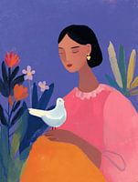Een zacht en poëtisch kunstwerk waarin een vrouw met gesloten ogen een vogel in haar hand draagt. De harmonie tussen de roze en paarse tinten en het frisse wit van de vogel creëert een sfeer van rust en verbinding met de natuur. Een portret dat sereniteit en dromerigheid uitstraalt.