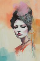 Kleurrijk portret in pastelkleuren van een jonge vrouw met gesloten ogen. Modern portret met een poëtische uitstraling en sfeer.