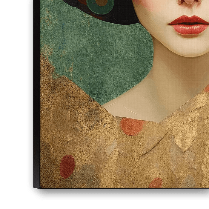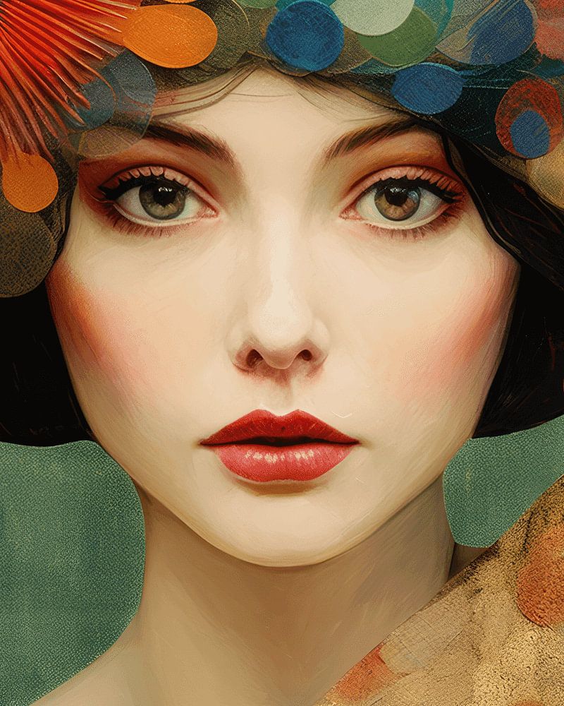 Kleurrijk portret met een vintage tintje. In vercshillende kleurtinten, onder andere goud, oranje en blauw. Kies zelf het formaat en het materiaal voor deze blikvanger.