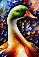Een kleurrijk digitaal schilderij van een eend. Het werk heeft een abstracte impressionistische stijl met felle kleuren en hoog contrast. Dit werk voegt een vrolijke en vriendelijke uitstraling toe aan ieder interieur!