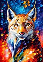Een kleurrijk digitaal schilderij van een Euraziatische lynx. Het werk heeft een abstracte impressionistische stijl met felle kleuren en hoog contrast. Dit werk voegt een vrolijke en vriendelijke uitstraling toe aan ieder interieur!