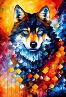 Een kleurrijk digitaal schilderij van een Wolf. Het werk heeft een abstracte impressionistische stijl met felle kleuren en hoog contrast. Dit werk voegt een vrolijke en vriendelijke uitstraling toe aan ieder interieur!