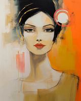 Kleurrijk portret van een jonge vrouw in gele en oranje tinten. Dit is een echte blikvanger voor je interieur. Kies zelf het formaat en materiaal en maak het helemaal naar jouw wens.
