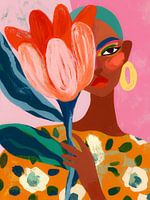 Dit levendige kunstwerk straalt kracht en individualiteit uit. Een vrouw met een turquoise hoofddoek en grote gele oorbel houdt een enorme bloem voor haar gezicht, waardoor haar intense blik extra opvalt. Haar kleding is feloranje met speelse bloemenpatronen, die prachtig contrasteren met de roze achtergrond en het diepe groen van de bladeren. De felle kleuren en gedurfde penseelstreken geven het geheel een moderne, energieke uitstraling. Een opvallend werk dat kracht, schoonheid en creativiteit in één beeld vangt.