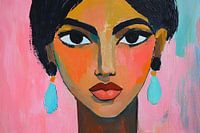 Dit kleurrijke schilderij toont een expressief portret van een vrouw met een warme en levendige uitstraling. De felle kleuren zoals roze, oranje en blauw springen direct in het oog en geven het kunstwerk een dynamische en moderne uitstraling. De nadruk ligt op het gezicht van de vrouw, haar grote ogen, volle lippen en donkere haar. De grote oorbellen in lichtblauw voegen een extra vleugje elegantie toe aan het geheel. Dit ontwerp zou perfect passen in een moderne inrichting, bijvoorbeeld in de woonkamer of op kantoor, en brengt een speelse maar toch stijlvolle sfeer in elke ruimte.