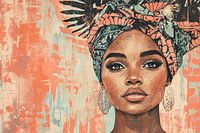 Dit unieke portret van een vrouw met een kleurrijke hoofddoek voegt direct sfeer en stijl toe aan elke ruimte. Het ontwerp combineert digitale kunst met een levendige kleurenpalet en gedetailleerde patronen, wat resulteert in een krachtig en expressief beeld. De zachte, warme tinten van oranje en beige worden perfect aangevuld door het koele blauw en groen in de hoofddoek, waardoor een harmonieuze balans ontstaat die de aandacht trekt. Ideaal voor in de woonkamer of slaapkamer, dit kunstwerk brengt zowel warmte als een eigentijds gevoel in het interieur. Perfect voor wie op zoek is naar een statement piece dat zowel stijlvol als betekenisvol is.