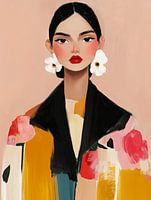 Portret van een jonge vrouw met zwart haar in een middenscheiding, roze wangen en rode lippen. Ze draagt opvallende witte bloem oorbellen en een kleurrijke jas met zwart, geel, roze en rood. De achtergrond is in een zachte perzikkleur.