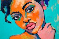 Een expressief portret schittert in levendige kleuren en inspireert met zijn krachtige penseelstreken en stralende, heldere huidskleur. De zachte contouren en spookachtige blik geven het een moderne, artistieke flair. Dit meesterwerk is perfect voor een woonkamer om gesprekken te stimuleren en een creatieve sfeer te creëren.