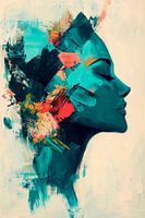 Een harmonieus samenspel van sterke blauwe en rode tinten streelt een zacht profiel dat blijft hangen in meditatieve stilte. De dynamische penseelstreken geven het beeld een levendige energie die aanzet tot dromen. Ideaal voor de slaapkamer, het creëert een ontspannen sfeer en stimuleert de verbeelding.