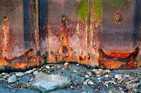Aan de rand en begin van het strand wordt de boulevard van Wimereux Frankrijk versterkt door middel van stalen profielwanden. Het zeewater slaat hier dagelijks op stuk en vreet het staal aan. Op de foto is dat goed te zien. Er ontstaan hierdoor mooie kleuren en kleurencombinaties.