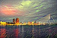 Ons algoritme beheerst de kunststijl futurisme. Dit creeert een gevoel van beweging in het kunstwerk. Het gekleurde wolkendek boven Rotterdam waait daarom erg mooi boven de Erasmusbrug. De maas golft wat in de avond.