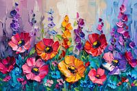 Dit levendige en kleurrijke schilderij van een bloemenveld brengt een explosie van kleur en energie in elke ruimte. De felle rode, gele, blauwe, paarse en groene tinten creëren een dynamische en vrolijke sfeer. Het abstracte ontwerp vangt de schoonheid en diversiteit van de natuur op een unieke manier, waardoor het een perfect kunstwerk is voor moderne interieurs. Of je het nu in de woonkamer, slaapkamer of kantoor plaatst, dit schilderij zal ongetwijfeld een opvallend middelpunt vormen. Het is een prachtige keuze voor liefhebbers van kleurrijke en expressieve kunstwerken die een vleugje natuur en vrolijkheid in hun huis willen brengen.