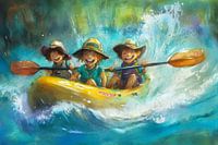 Schilderij met drie kinderen in een gele kano die door wilde wateren peddelen. Ze hebben veel plezier. Ze dragen hoeden en hebben elk een peddel vast. De achtergrond is een mix van groene, blauwe en witte tinten, wat de beweging en het opspattende water benadrukt. Het schilderij…