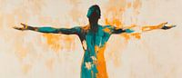 Een uitdrukking van vrijheid en levensvreugde overspoelt de kamer: een mysterieuze man met uitgestrekte armen, gehuld in levendige kleuren, straalt energie uit. De dynamische blauw- en oranjetinten geven het beeld een inspirerende diepte. Ideaal voor een woonkamer, het creëert een uitnodigende sfeer en zet aan tot nadenken.