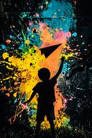 Dit kleurrijke ontwerp combineert een levendige achtergrond met een silhouet van een kind dat een papieren vliegtuigje in de lucht gooit. De explosieve kleuren en spatten creëren een dynamische en speelse sfeer, perfect voor moderne interieurs. De combinatie van Street Art-stijl en abstracte expressie zorgt voor een uniek statementstuk. Het ontwerp roept gevoelens van creativiteit, vrijheid en jeugdige energie op. Ideaal voor een speelse touch in je huis of werkruimte.