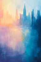 Een vleugje stedelijkheid zweeft door zachte tinten blauw, paars en oranje, terwijl silhouetten van majestueuze gebouwen opdoemen. Dit dromerige stadslandschap vangt het spel van licht en schaduw en creëert een rustgevende sfeer. Ideaal voor de woonkamer, waar het gesprekken stimuleert en creatieve inspiratie losmaakt.