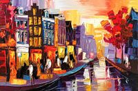 Dit kleurrijke kunstwerk toont een levendig stadsgezicht vol energie en dynamiek. De gedurfde penseelstreken en felle kleuren geven de stad een expressieve uitstraling, terwijl de reflectie van de gebouwen en bomen in het water een serene balans brengt. Dit schilderij roept de sfeer op van een bruisende straat bij zonsondergang, waar de…