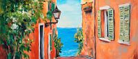 Een schilderachtige doorgang, omringd door levendige oranje gekleurde muren, nodigt je uit om te dromen. De zachte golven van de zee schitteren op de achtergrond, terwijl de vintage luiken charmant open staan. Dit kunstwerk geeft de woonkamer een uitnodigende sfeer en creëert een vakantiestemming binnen je eigen vier muren.
