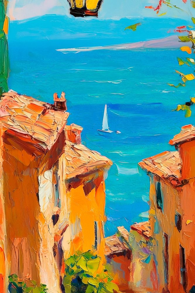 Zonovergoten steegjes in warme, uitnodigende kleuren voeren de kijker mee naar de kust. De zachte golven van de zee worden weerspiegeld in de stralende lucht, terwijl een nostalgische lantaarn een gevoel van gezelligheid creëert. Ideaal voor de woonkamer, waar het een ontspannen vakantiesfeer creëert en dromen van verre oorden opwekt.