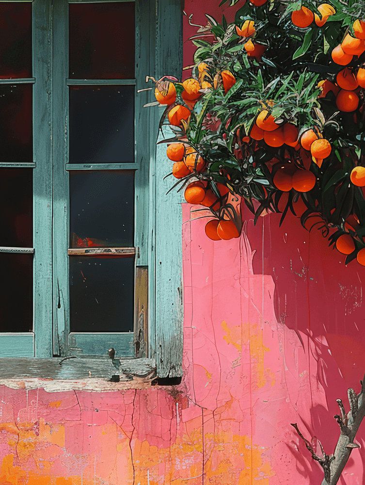 Kleurrijk straatbeeld van een blauw kozijn in een roze woning met een sinaasappelboom ernaast. Een plaatje zoals je het in Zuid-Europa of Zuid-Amerika tegen kan komen.